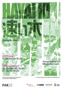 Für HAYAI KI /速い木 [schneller Baum] bevölkern zwei Hybriden aus Rasenmähroboter und Pflanze, Maschine und Organismus den Ausstellungsraum. Die Roboter machen Pflanzen mobil und räumten ihnen neue, semi-autarke Bewegungsspielräume ein. Die plötzliche Aktivität schafft eine ungewohnte Ausstellungssituation: Die Besucher:innen sind eingeladen den Werken wortwörtlich begegnen, ihnen auszuweichen und sich folglich mit einer neuen Achtsamkeit durch den Raum zu den anderen statischen Werken zu bewegen.