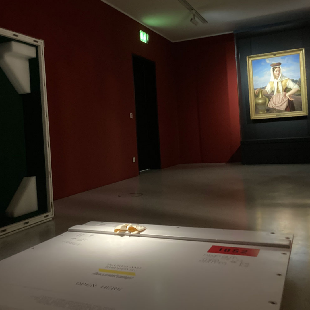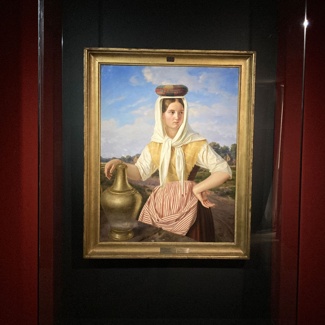 Ich überfliege den Saaltext, verschaffe ich mir einen Überblick. Die Künstlerin hat verschiedene Objekte im Ausstellungssaal drapiert, ein roter Samtvorhang hängt von der Decke, breitet sich auf dem Boden aus. Überdimensionierte Hundehalsbänder mit Stacheln für haushohe bissige Köter liegen auf dem nackten Boden. Ein Filetiermesser hängt in einem Ledergürtel an der Wand, daneben Kuhglocken (?), Hack Klötze zum Klötze hacken. Im Nebenraum dann ein Gemälde von einem jungen Bauernmädchen. Biedermeyer. 1834. Laut Saaltext von Adolf Schmidt, die erste Anschaffung des Kunstvereins. Das Milchmädchen.