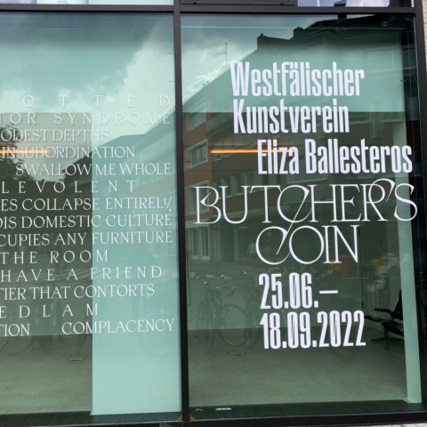 Von vorne: Butchers Coin. Die erste institutionelle Ausstellung von Eliza Ballesteros. Vier Euro kostet der Eintritt momentan im Westfälischen Kunstverein. „Acht Mark“, sagt Mutter immer. Gut, acht Mark. Acht Mark kann man schon machen, denke ich.