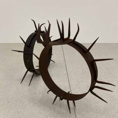 Ballesteros hat sich viel mit Domestizierung auseinandergesetzt, steht im Saaltext. Domestizierung der Tiere. Domestizierung der Frauen. Macht. Herr. Sklave. Opfer. Schlachter. Schlachthaus. BDSM Studio. Begierde. Fetischismus. Das sind Begriffe, die fallen, sich in den Objekten wiederfinden.