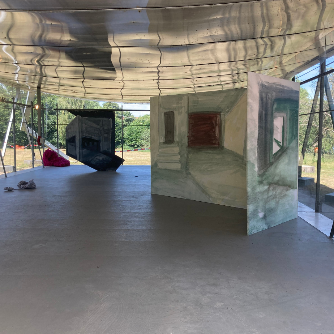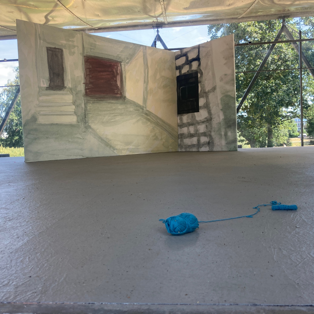 Der Wewerka Pavillon: Wollknäuel auf dem Boden, auf Stellwänden grob gemalte Treppenstufen, Fenster, leere Räume. Hansol Kangs Kindheitserinnerungen.