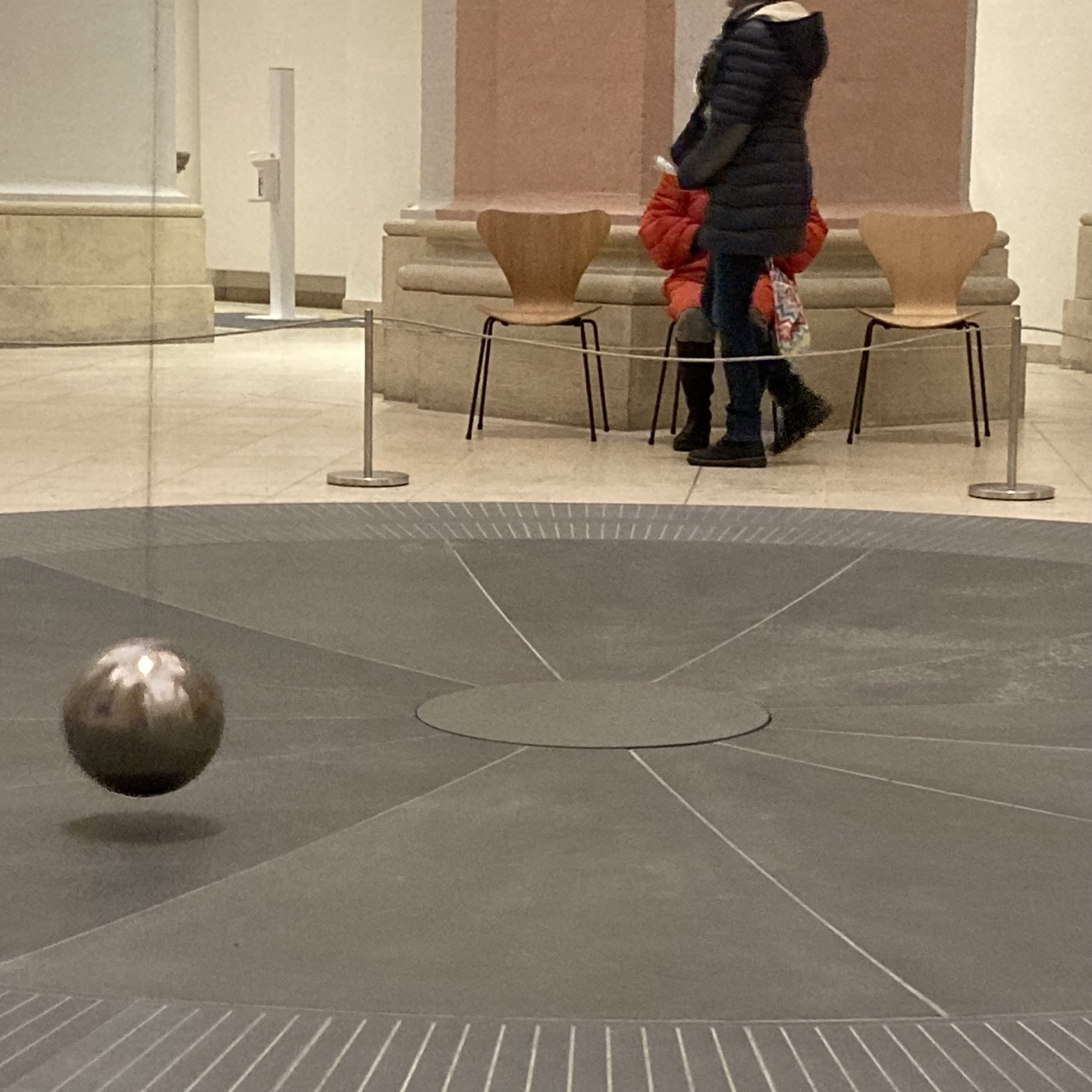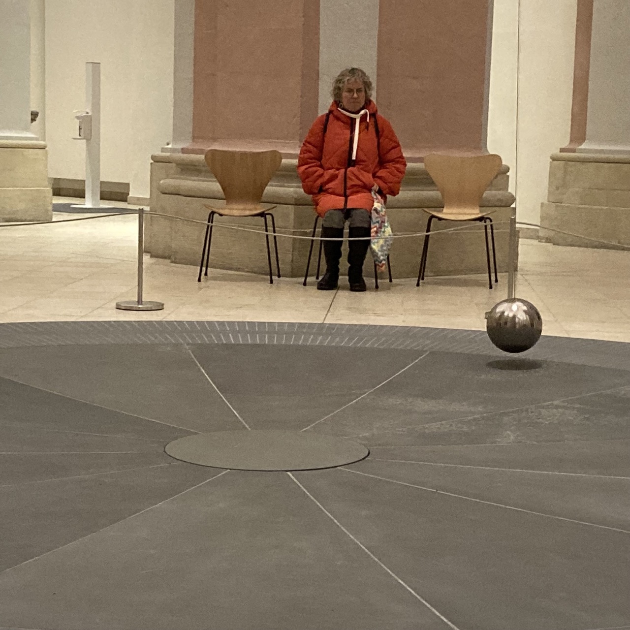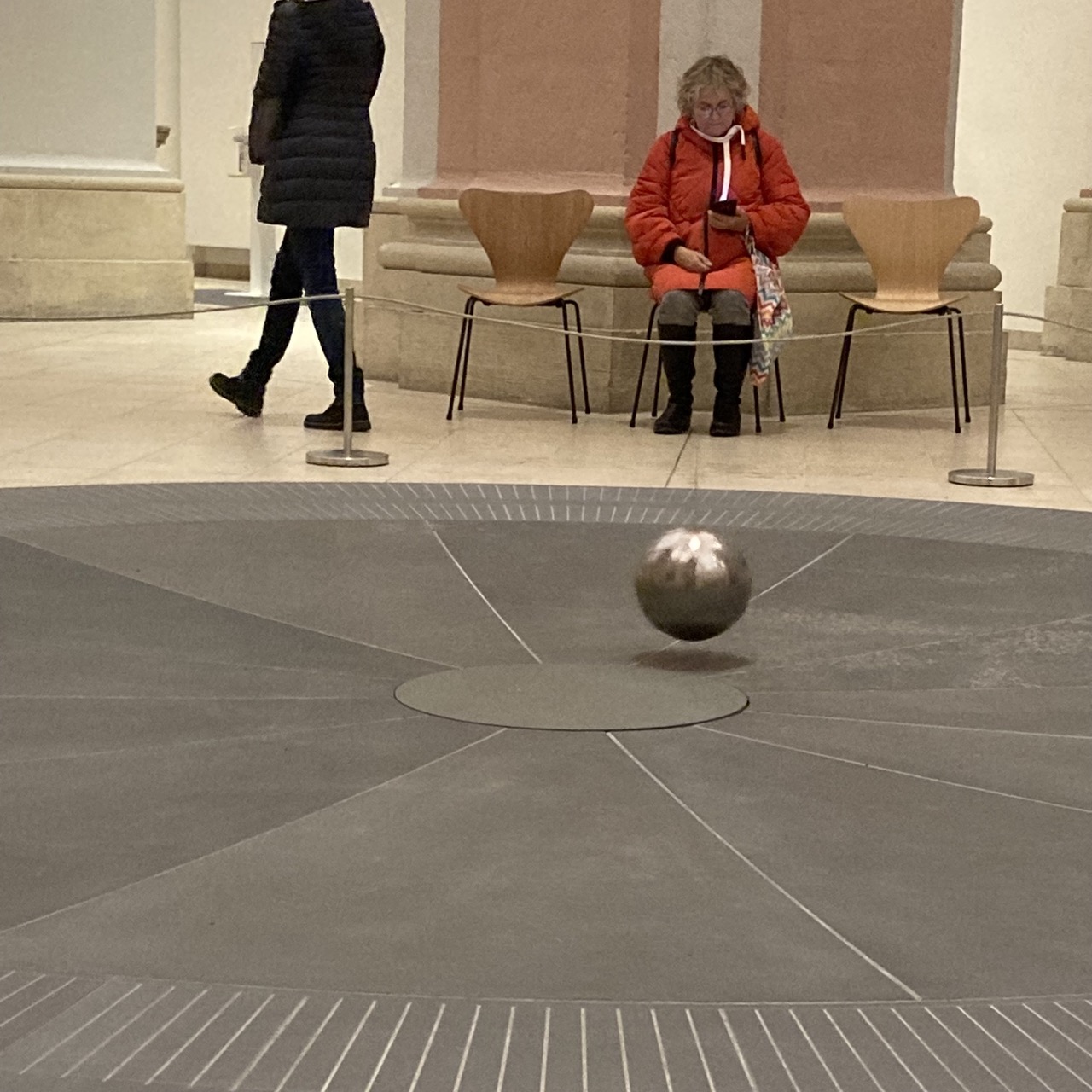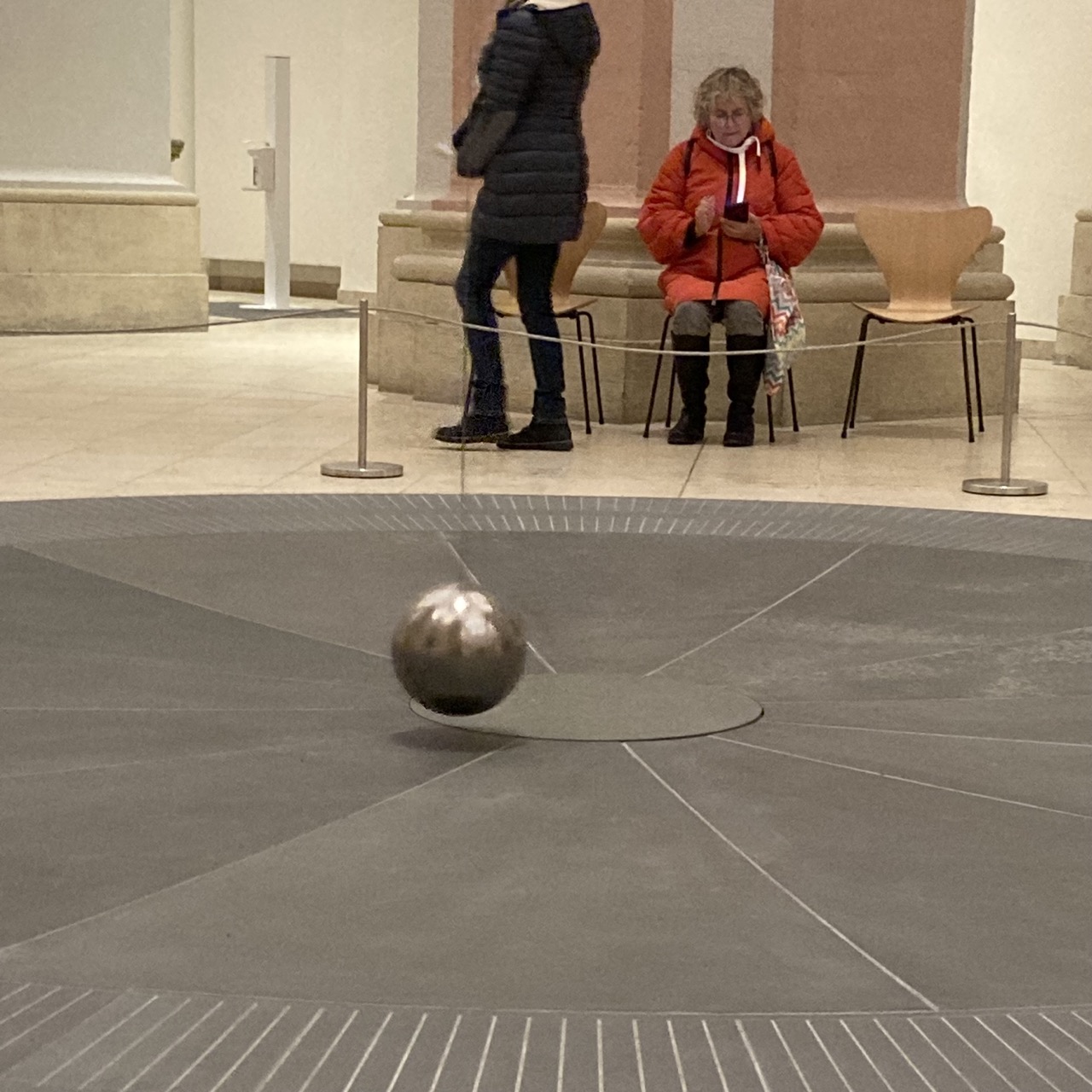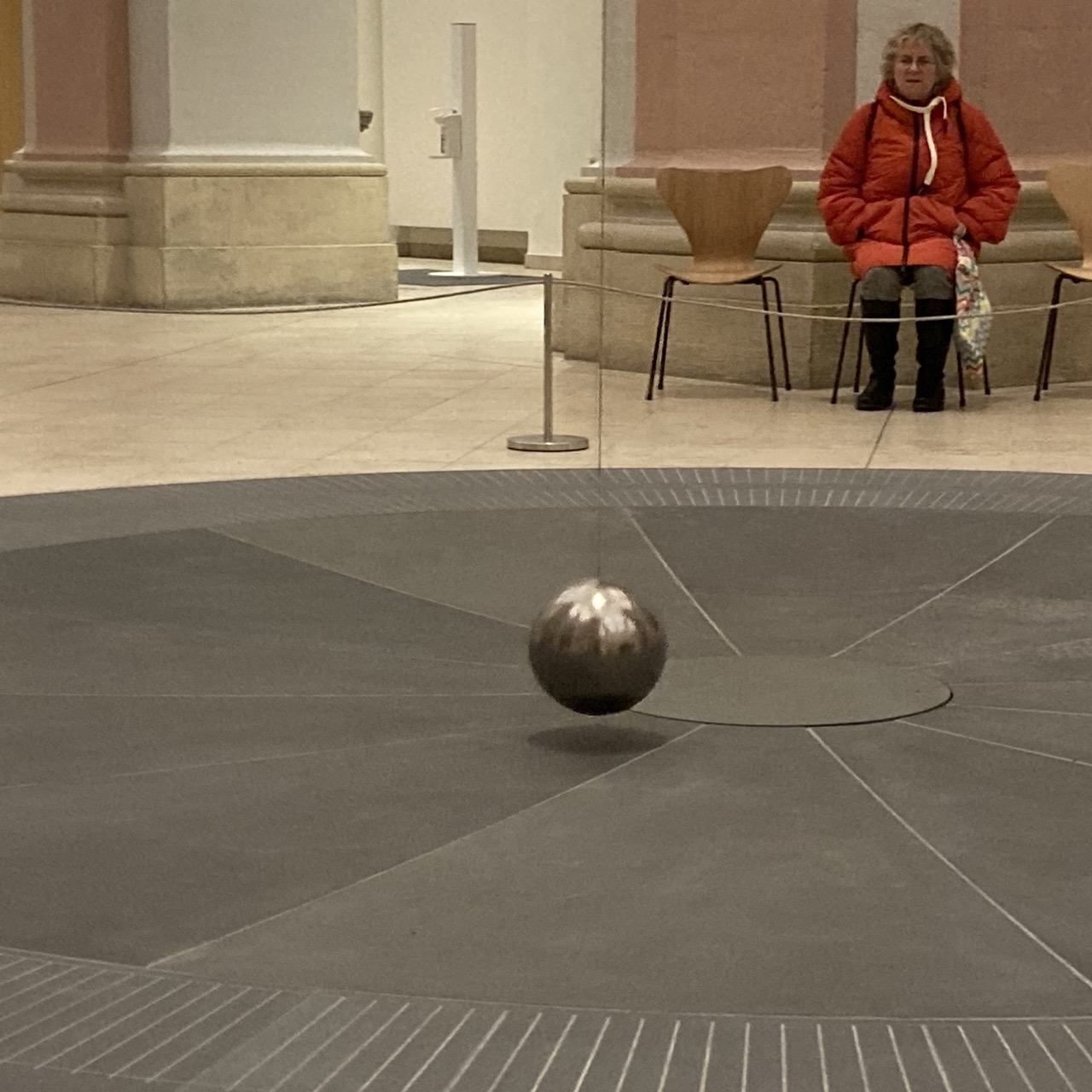 Wie auch immer: Der Trubel auf der Salzstraße, die Glühweinbrüder und -Schwestern hinterm Rathaus sind kurz vergessen, wenn er:sie vor dem Pendel Platz nimmt. Hier schwingt nicht die gute Laune, hier schwingt die Wissenschaft im Stelldichein mit der Kunst. Und bei der ganzen Schwingerei stellt man sich Fragen. Tiefe Fragen. Es schwingt nach rechts und ich atme ein. Es schwingt nach links, und ich atme aus.