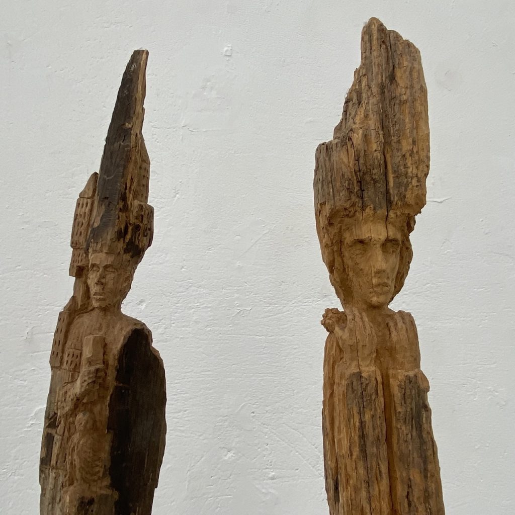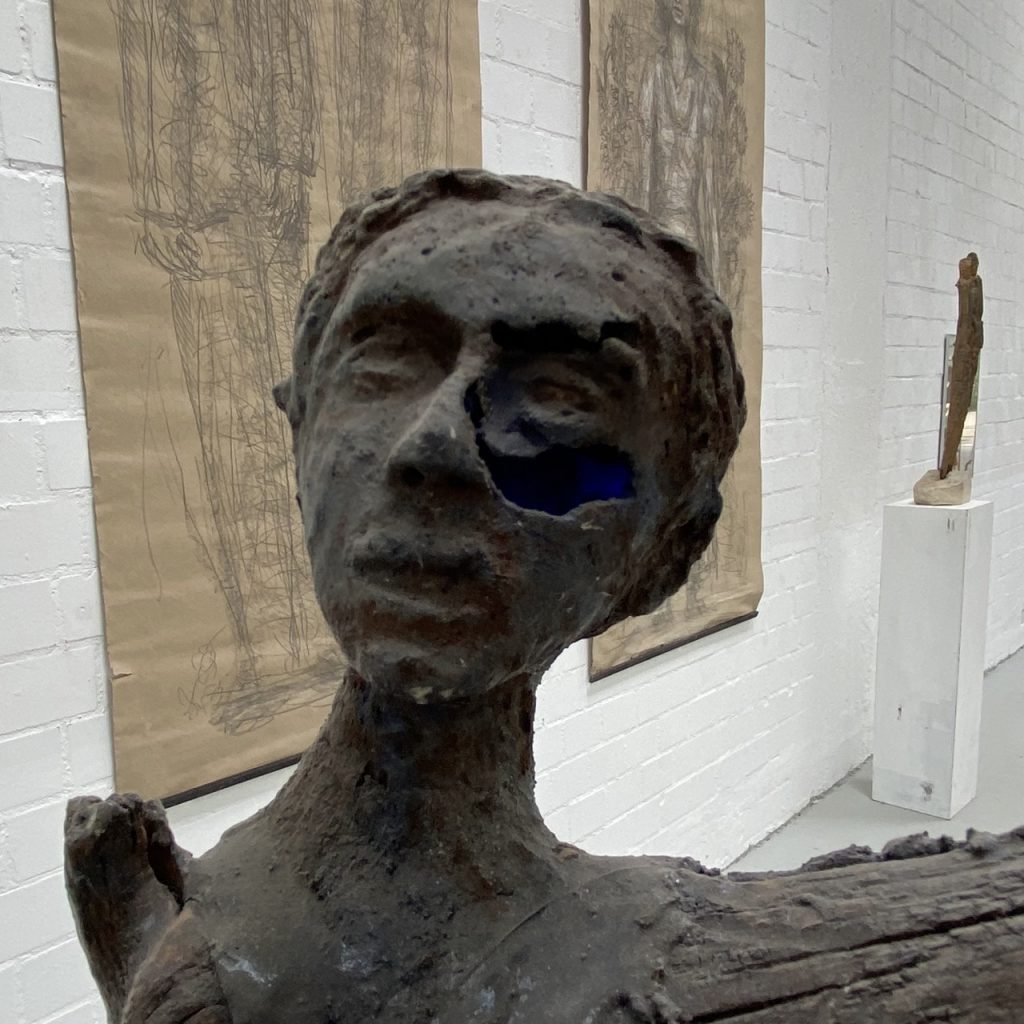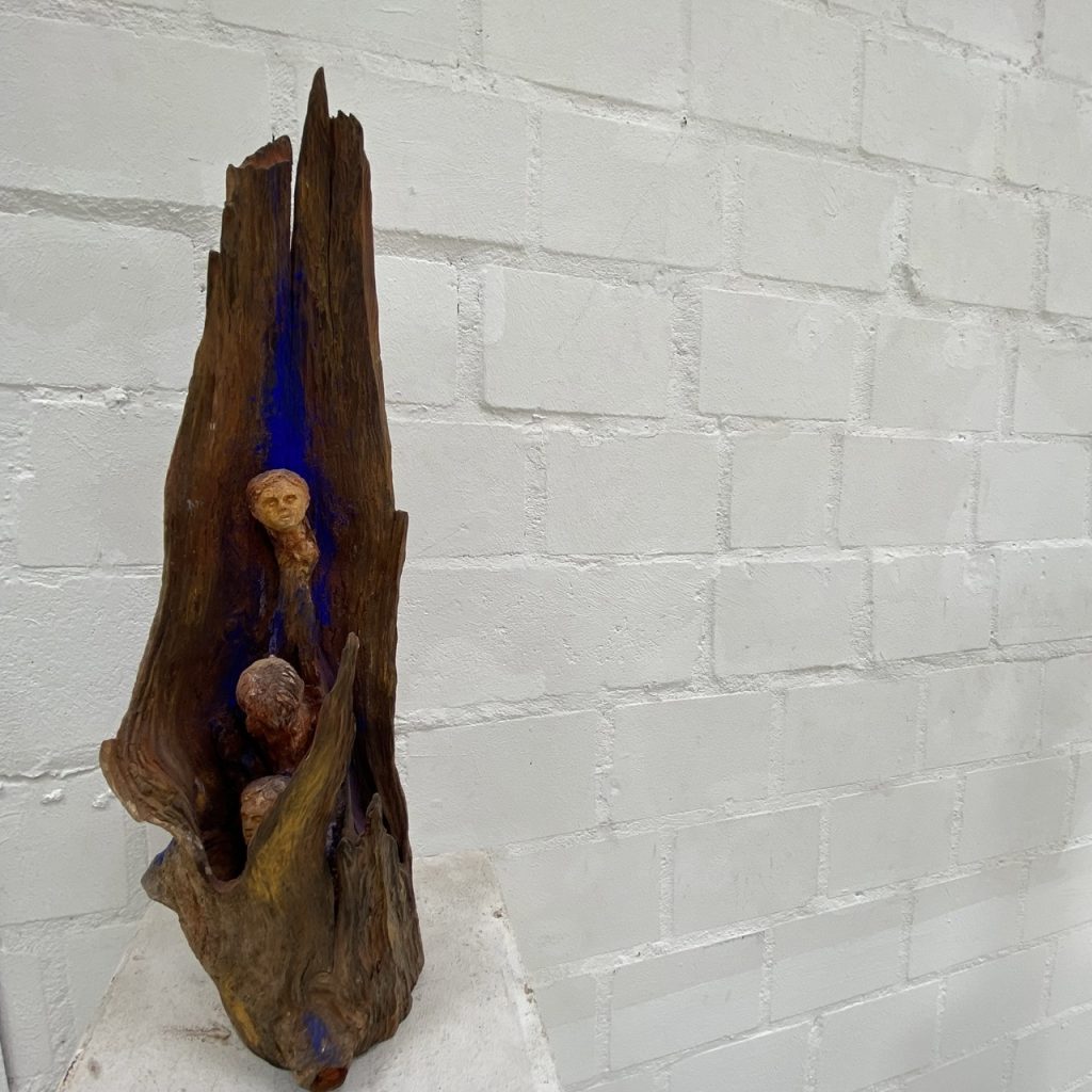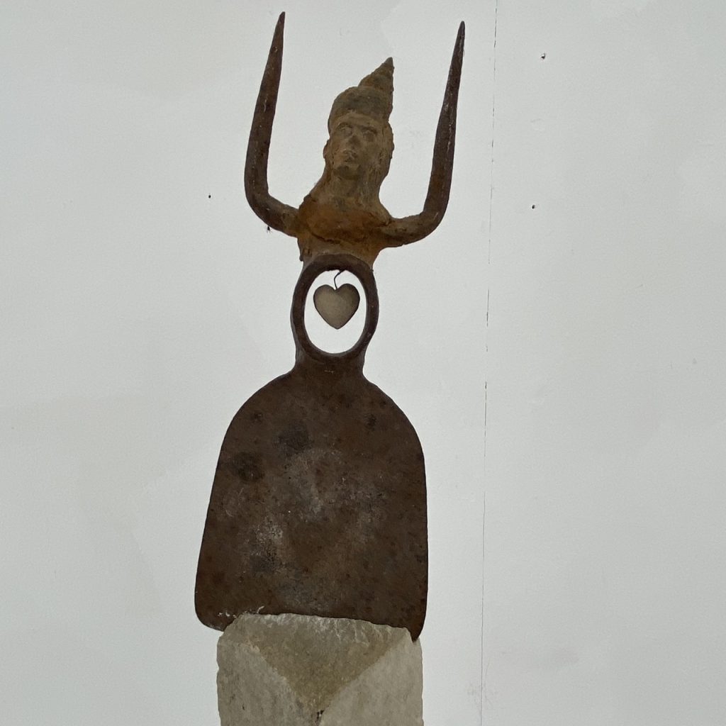 Hetzel nutzt Naturmaterialien, verarbeitet Fundstücke für seine oft figürlichen Objekte. Alte Wurzeln, Treibholz, Muscheln, einen verrosteten Spaten, Motorteile vom alten VW-Bus. Das klingt alles nach Hippie-Basteln und Achtsamkeits-123 ist aber alles andere als Kleinkunst-Patschi.