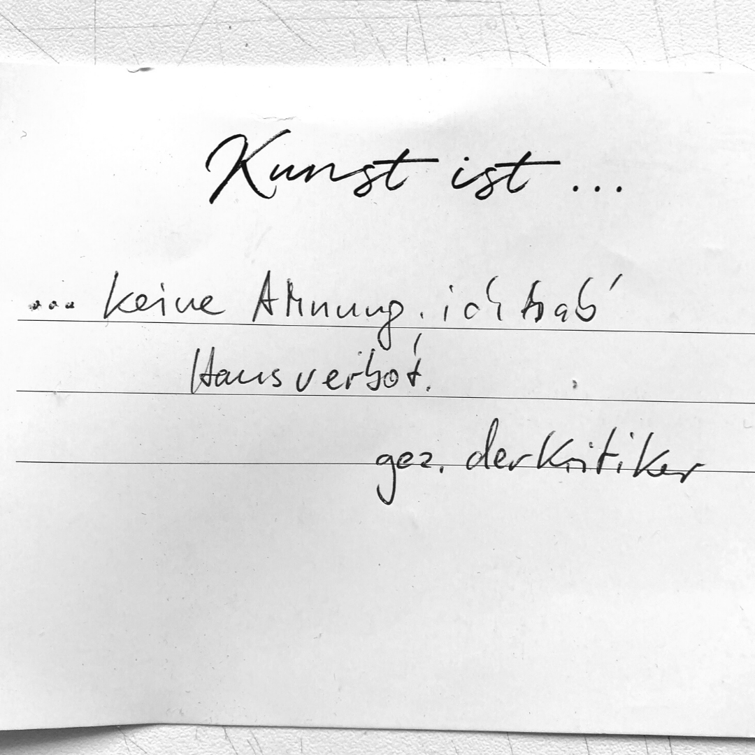 „Bitte langsam!“ Kurzfristig herrschte ein großer Ansturm auf die Ausstellung im cuba Foyer. Kunst und Geld eben. Man schlich sich herein, guckte, ob man nicht gesehen wird, verdeckte sein Gesicht, wie es nur ein Hallodri oder sein Seeräuber zu verdecken pflegt. Fremde brachten sich sogar Werkzeug mit, um die Scheinchen unbeschadet von der Wand zu bekommen (Es fragt sich, ob sie auch sonst so pfleglich mit der Kunst umgehen?). Freunde wurden erst gar nicht zu dieser Ausstellung eingeladen. Geld zerstört Freundschaften, sagt man, aber das war nicht der einzige Grund. Eine Eröffnung mit Freunden sollte es nicht geben, da nach der Eröffnung nichts mehr zu sehen und zu holen gewesen wäre. Man kennt doch die sogenannten Freude. Ein bisschen Ausstellung hätte der Künstler sich schon gewünscht. Wenigstens bis die Presse da war. Aber…ne.