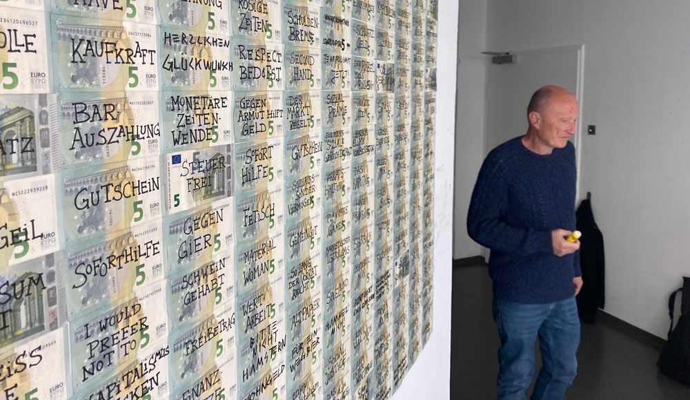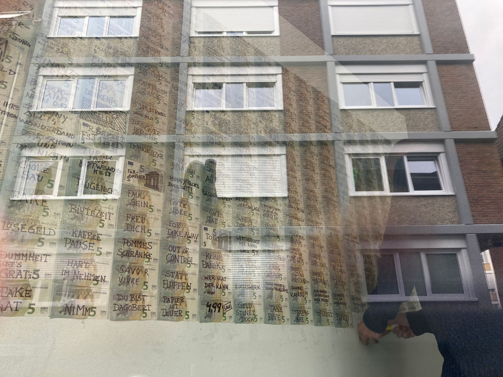 Aber mal kurz von vorne: Oliver Breitenstein klebt seit geraumer Zeit Geldscheine, draußen auf der Straße, in den Außenraum, in den Öffentlichen Raum, wenn es den noch gibt.