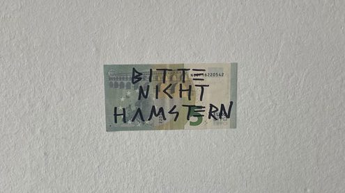 „Bitte nicht hamstern!“ stand auf einem der Scheine. Aber sie haben gehamstert! Es war eine Hamsterorgie. Ein Hamsterschlachtfest. Am Ende hingen die Scheinchen noch nicht einmal einen Tag. Oliver Breitensteins Ausstellung „Popbank“ im cuba war, so gesehen, ein voller Erfolg.