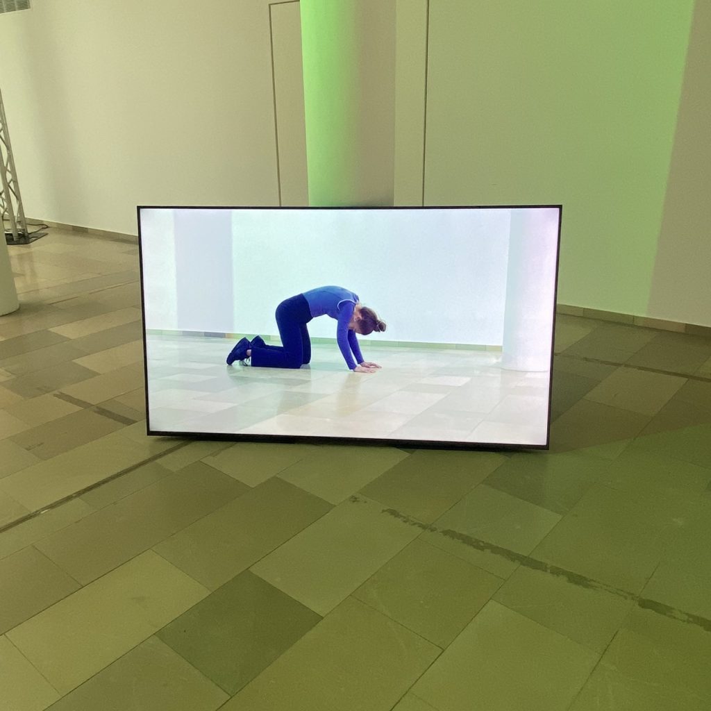 Ein großes weißes Plakat im Eingangsbereich erklärt: „In How Do You Want to Feel Today? vermischen sich Körper, Text und Sound zu einer raumgreifenden Komposition aus Trance, Hörsturz, Meeresrauschen.“ Mehrere große Monitore zeigen Personen, die Übungen machen. Zuerst vermutet ich, dass das was für Seele, Geist, Gesundheit ist.