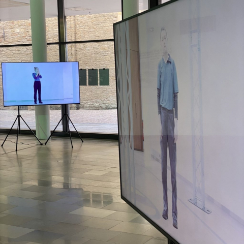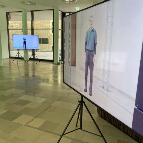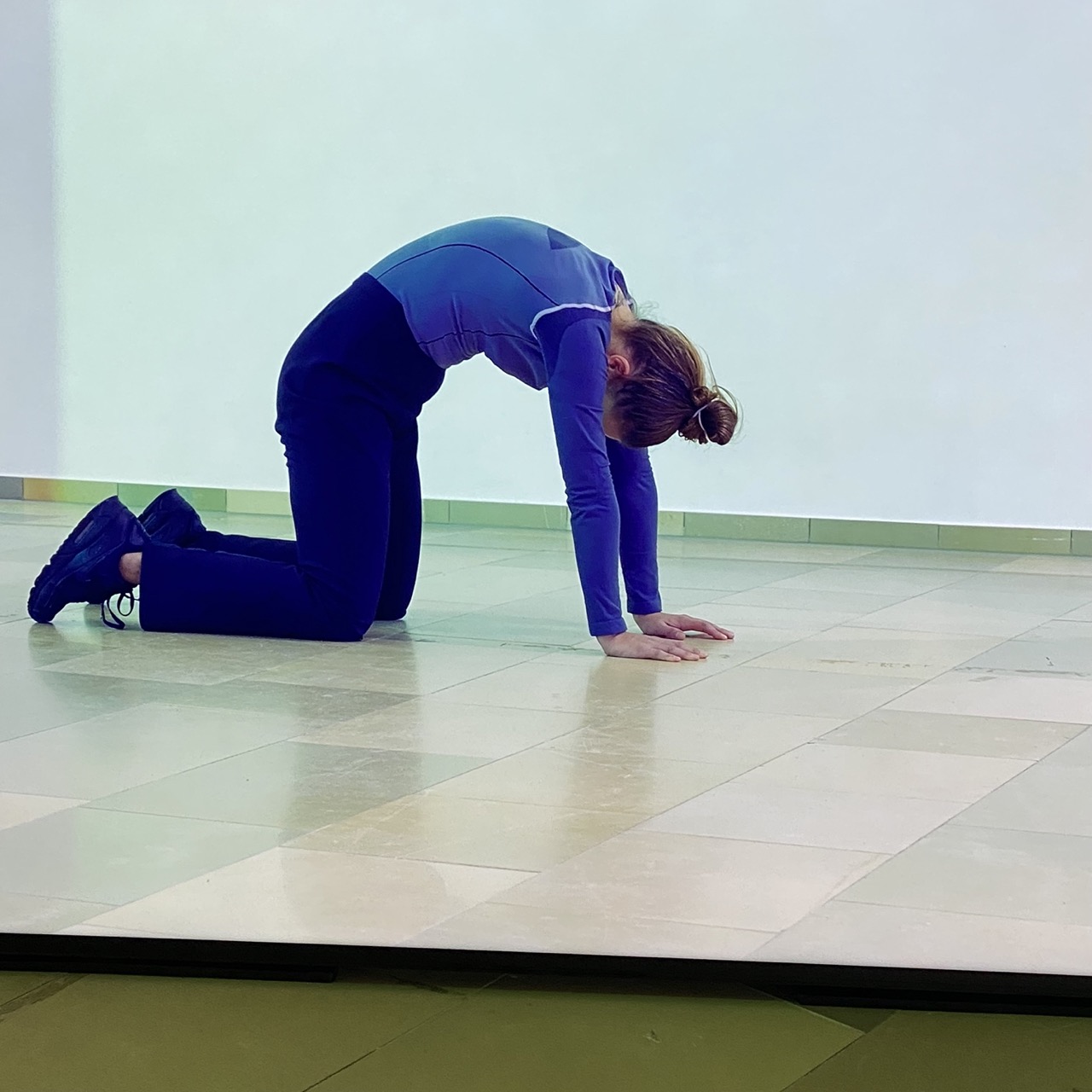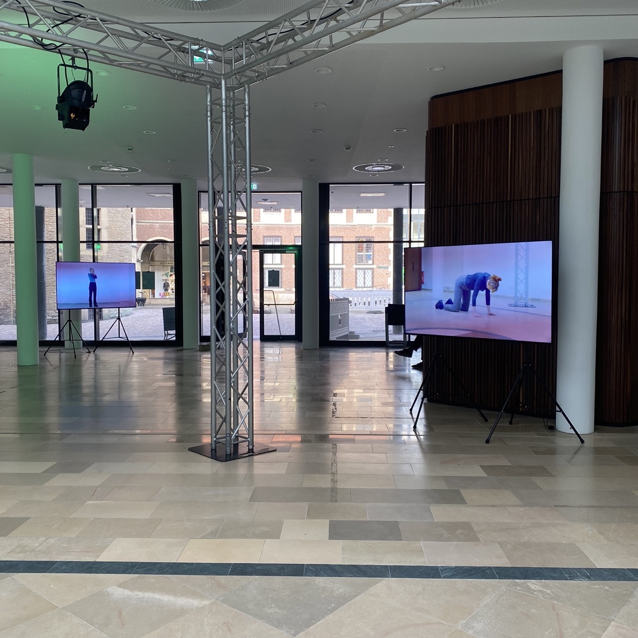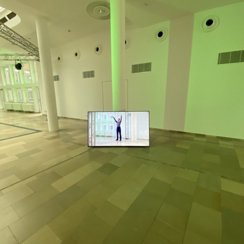 Ein großes weißes Plakat im Eingangsbereich erklärt: „In How Do You Want to Feel Today? vermischen sich Körper, Text und Sound zu einer raumgreifenden Komposition aus Trance, Hörsturz, Meeresrauschen.“ Mehrere große Monitore zeigen Personen, die Übungen machen. Zuerst vermutet ich, dass das was für Seele, Geist, Gesundheit ist.