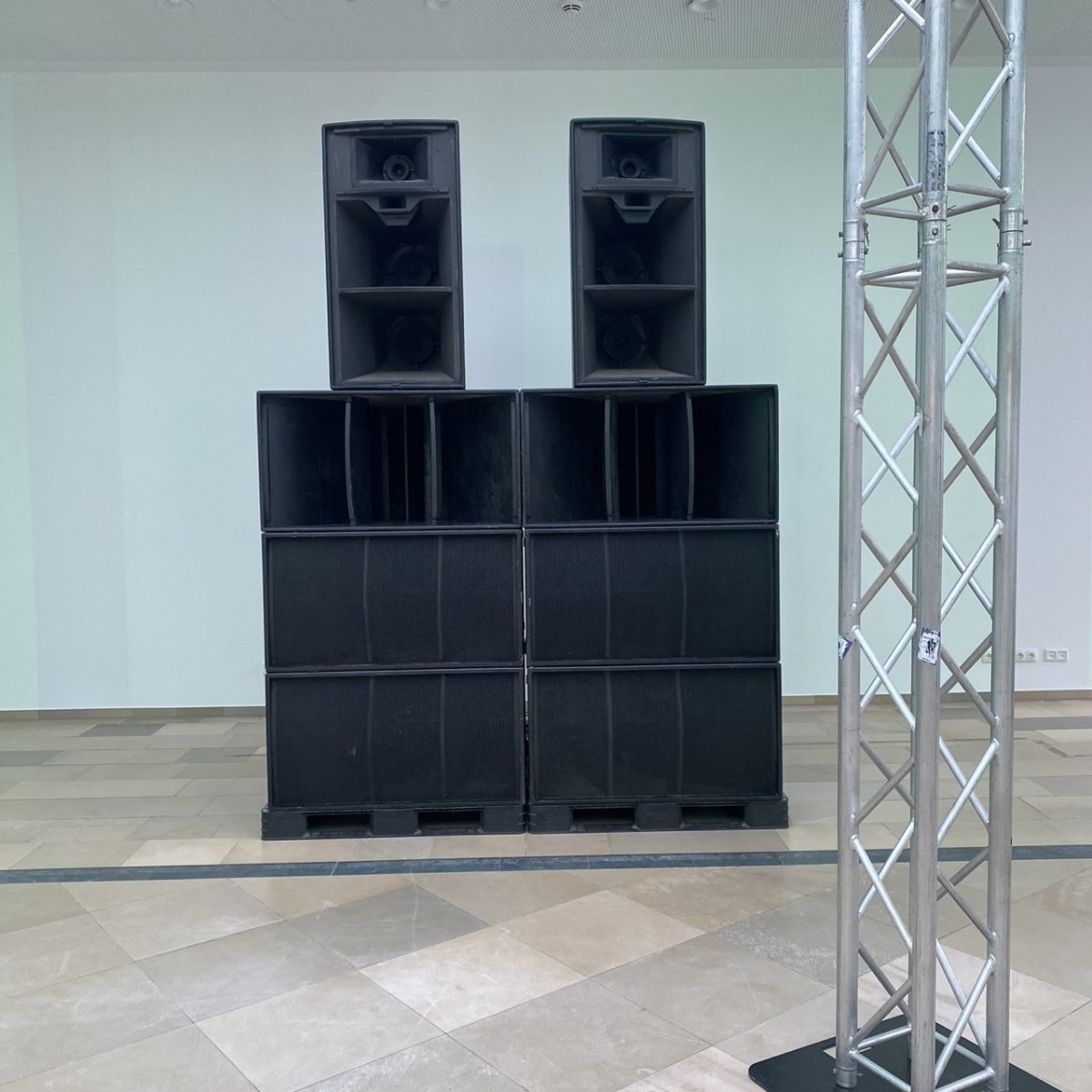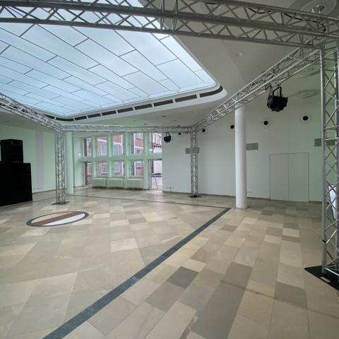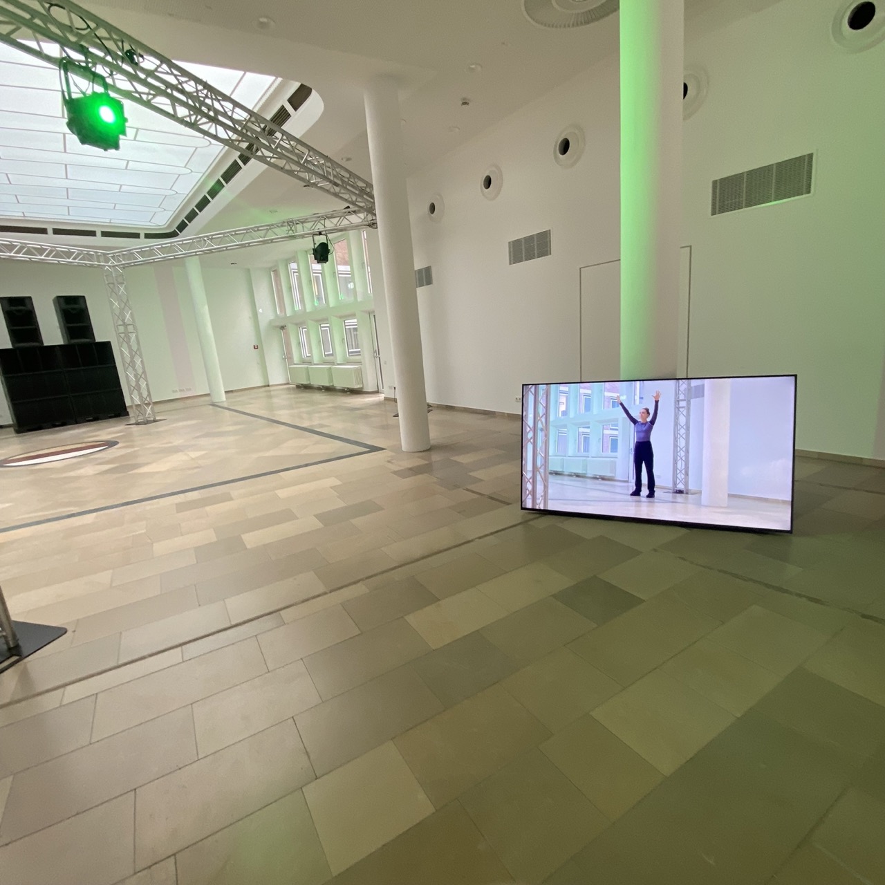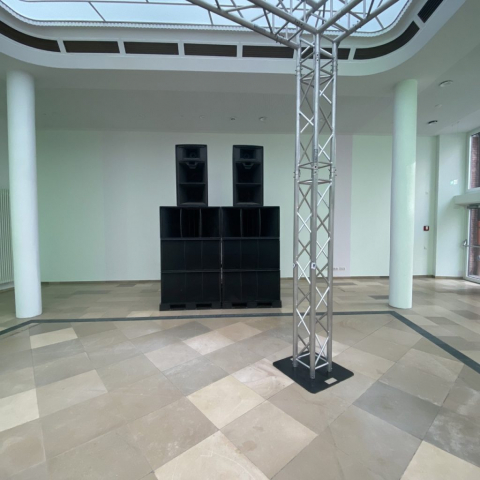 Aus einem Boxenturm, den man eher auf einem Festival erwartet, kommt Experimentelles, Geräusche, Stimmen. Der Turm beschallt die Stadthausgalerie, aber vor allem eine Tanzfläche mit Münster-Logo, die durch vier Traversen, wie du sie aus dem Club- und Konzertalltag kennst, eingezäunt wird. Das große weiße Plakat sagt: Der Sound regt „eher zum Herausrennen als zum Verweilen an.“
