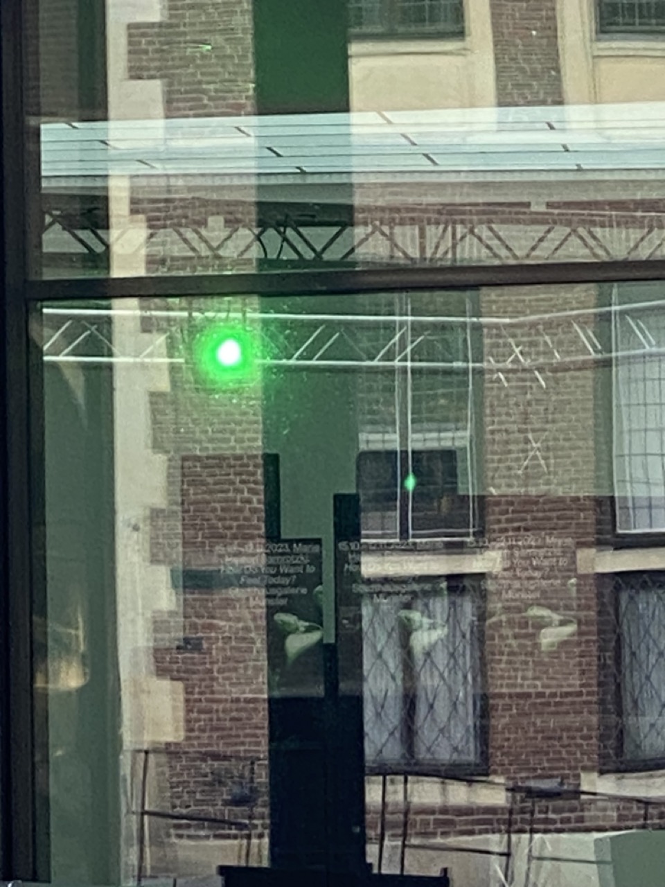 Aber nicht doof schwer. Tatsächlich habe ich was ganz anderes erwartet. Mehr subjektive Betroffenheit. Die sehe ich dann aber gar nicht. Ein grünes Licht blendet mich. Es gehört einer Sicherheitsfirma, die uns 24/7 im Auge hat. Sie sehen dich. Ja, Ich finds geil. Oder geilo. Aber … ich bin auch geblendet.